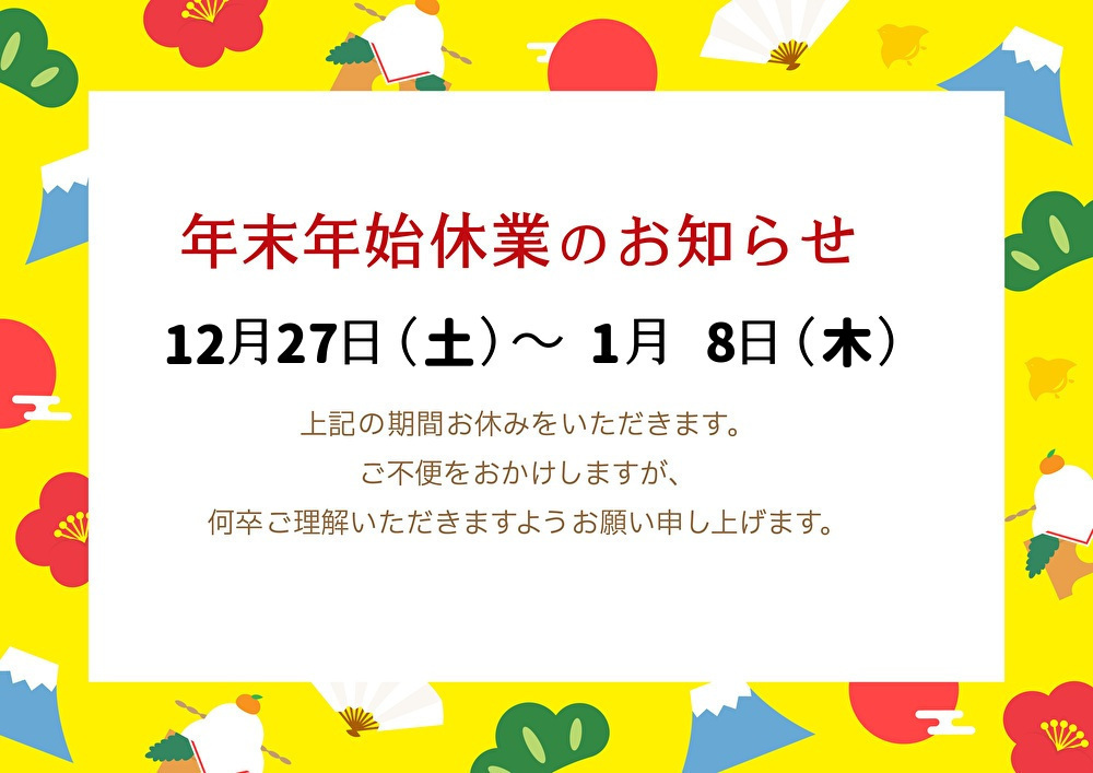 年末年始のお休みについて お知らせ 2025.12.08 誠に勝手ながら、年末年始は、下記でお休みをいただきます。 12月27日(土) ~ 1月8日(木) ご迷惑をお掛けしますが、何卒よろしくお願いします。